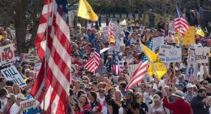 | Occupy Wall Street gathering. Notice the absence of American flags. |